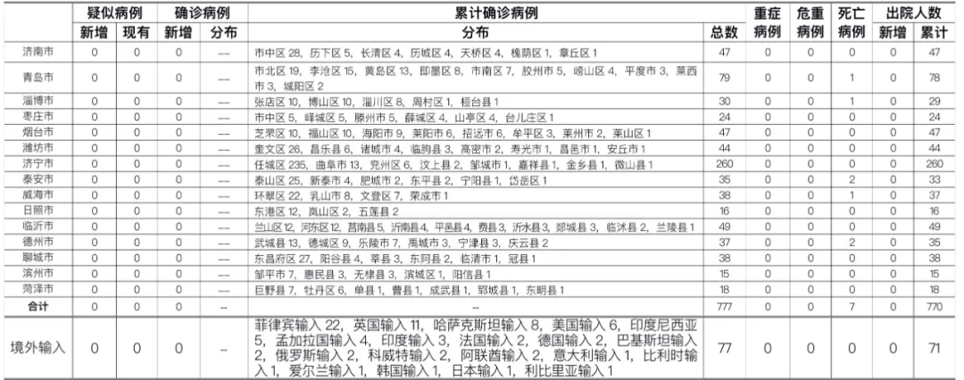 备注:1.山东省本地病例按确诊时医院所在县区统计,境外输入病例单独统计。