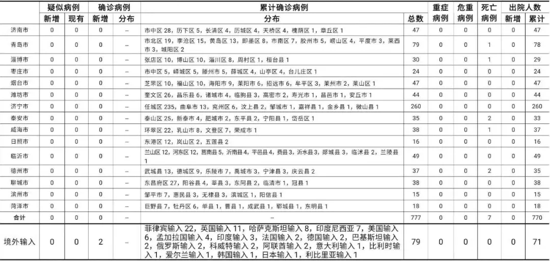 2020年12月2日0时至24时:山东无新增本地疑似病例、确诊病例。累计报告确诊病例777例,死亡7例,治愈出院770例。山东无新增境外输入疑似病例,日照市报告印度尼西亚输入确诊病例2例(1例由无症状感染者转归)。累计报告境外输入确诊病例79例,累计治愈出院71例。山东无新增无症状感染者。正在隔离观察治疗的无症状感染者9例(境外输入7例)。今年以来全省共追踪到密切接触者27683人,目前尚有654人正在接受医学隔离观察。详见下表(单位:例):