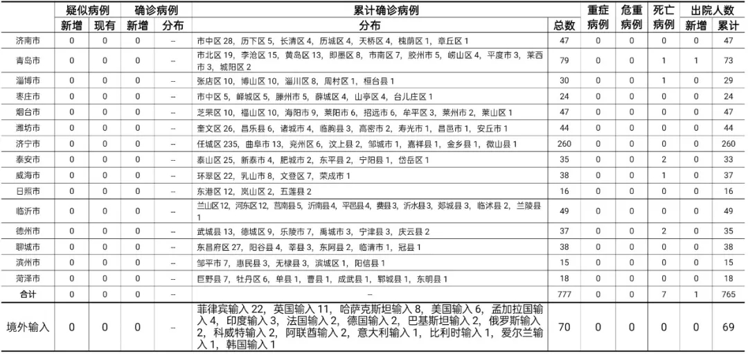 备注:1.山东省本地病例按确诊时医院所在县区统计,境外输入病例单独统计。