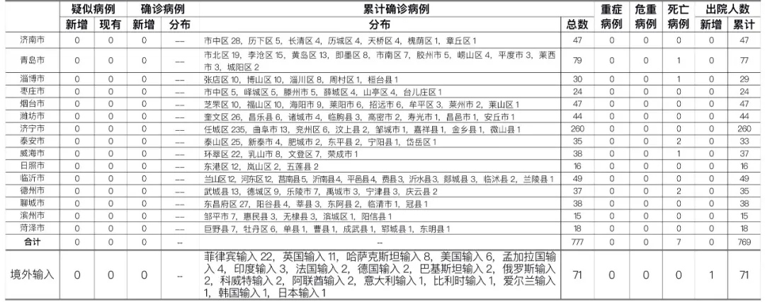 备注:1.山东省本地病例按确诊时医院所在县区统计,境外输入病例单独统计。