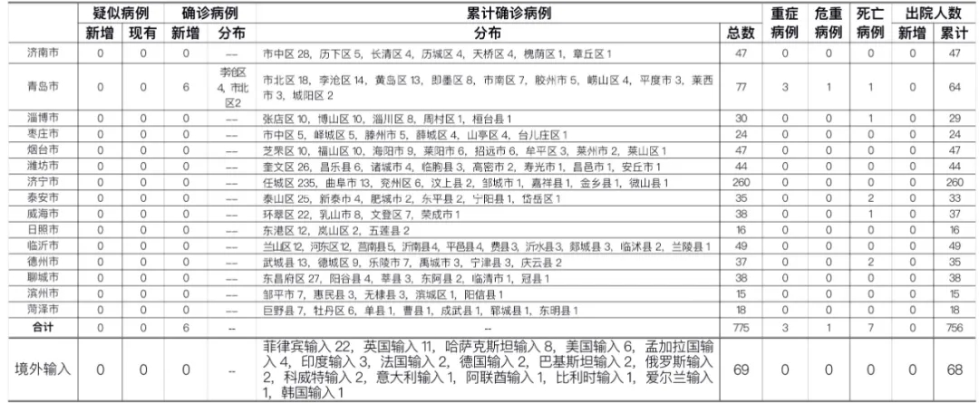 备注:1.山东省本地病例按确诊时医院所在县区统计,境外输入病例单独统计。