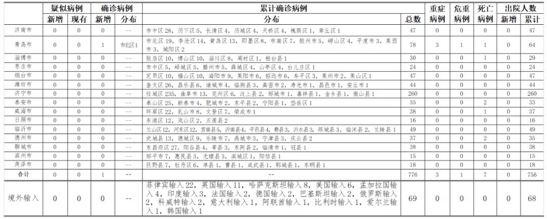备注:1.山东省本地病例按确诊时医院所在县区统计,境外输入病例单独统计。
