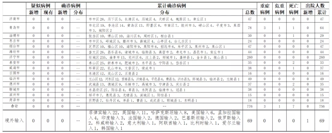 备注:1.山东省本地病例按确诊时医院所在县区统计,境外输入病例单独统计。