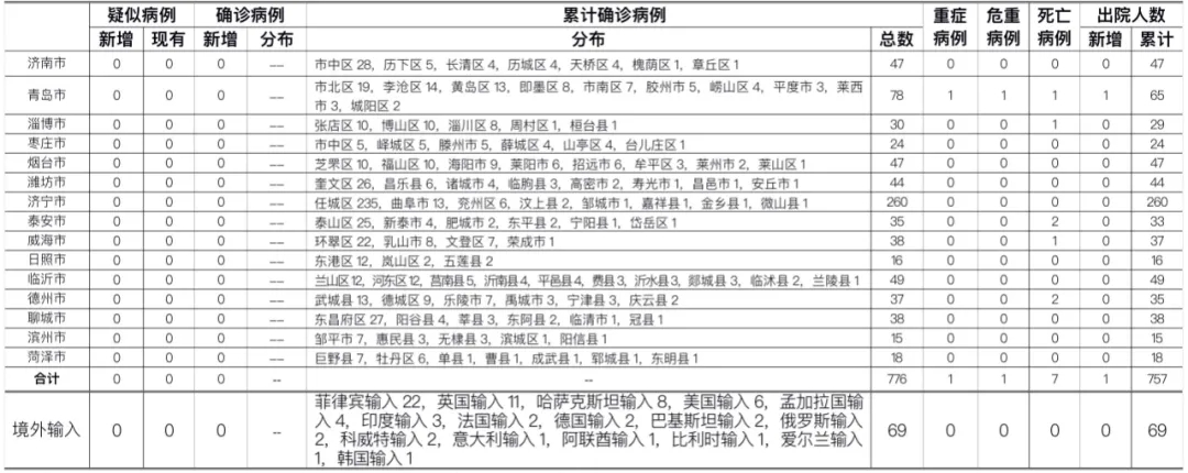 备注:1.山东省本地病例按确诊时医院所在县区统计,境外输入病例单独统计。