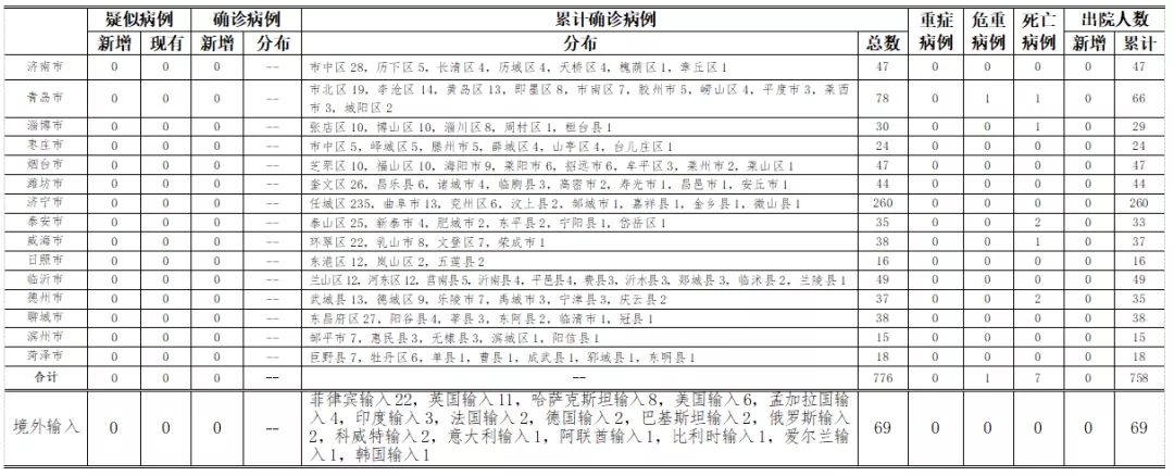 2020年10月24日0时至24时:山东无新增本地疑似病例、确诊病例。累计报告确诊病例776例,死亡7例,治愈出院758例。山东无新增境外输入疑似病例、确诊病例。累计报告境外输入确诊病例69例,累计治愈出院69例。青岛市报告境外输入无症状感染者1例。全省正在隔离观察治疗的无症状感染者2例(境外输入2例)。今年以来全省共追踪到密切接触者26450人,目前尚有531人正在接受医学隔离观察。详见下表(单位:例):