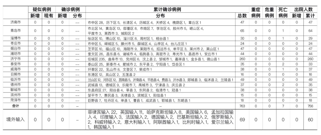 山东无本地住院疑似病例、确诊病例。累计报告确诊病例763例,死亡7例,治愈出院756例。