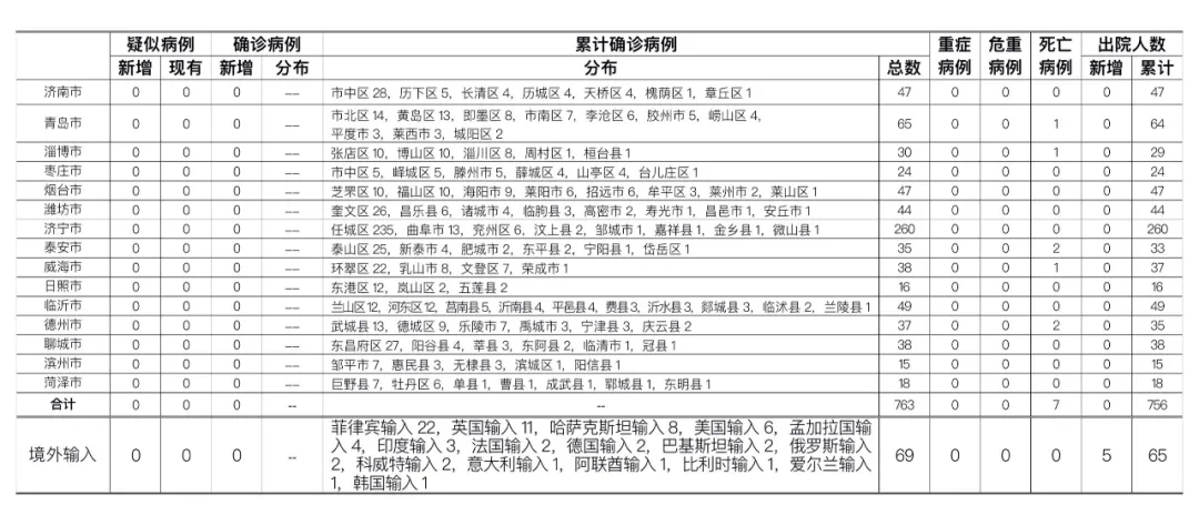备注:1.山东省本地病例按确诊时医院所在县区统计,境外输入病例单独统计。