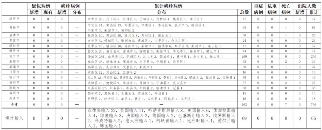 备注:1.山东省本地病例按确诊时医院所在县区统计,境外输入病例单独统计。