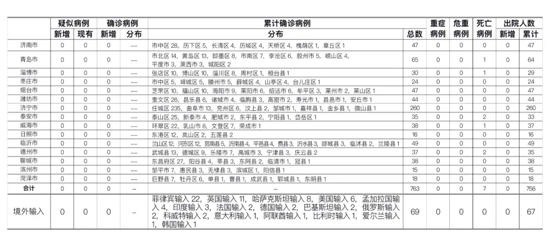 备注:1.山东省本地病例按确诊时医院所在县区统计,境外输入病例单独统计。