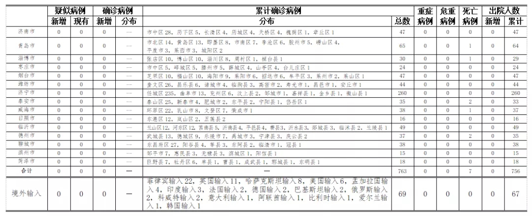 备注:1.山东省本地病例按确诊时医院所在县区统计,境外输入病例单独统计。