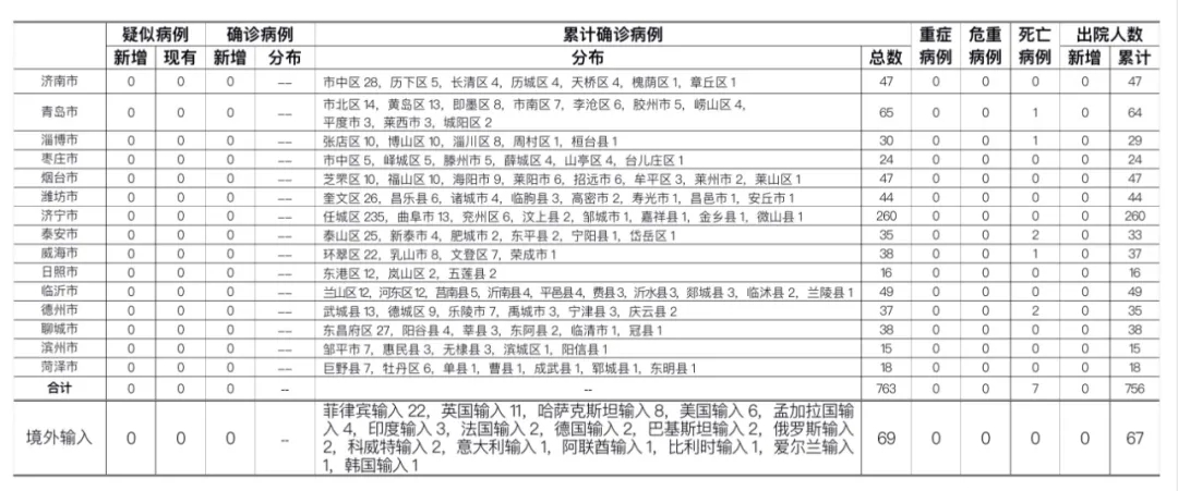 备注:1.山东省本地病例按确诊时医院所在县区统计,境外输入病例单独统计。