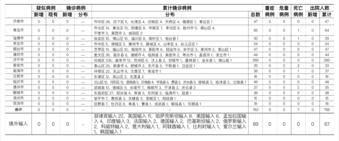 备注:1.山东省本地病例按确诊时医院所在县区统计,境外输入病例单独统计。
