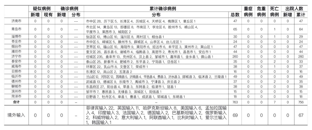 山东无本地住院疑似病例、确诊病例。累计报告确诊病例763例,死亡7例,治愈出院756例。