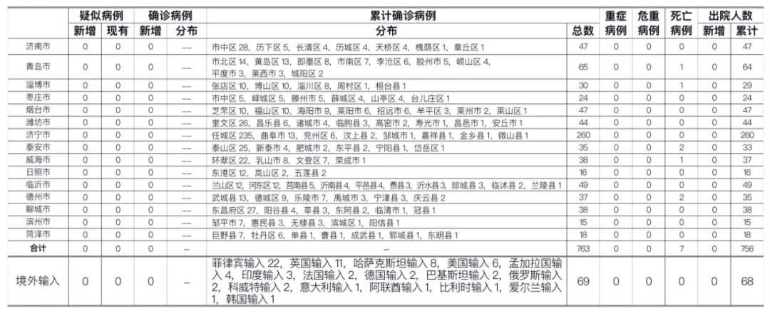 备注:1.山东省本地病例按确诊时医院所在县区统计,境外输入病例单独统计。