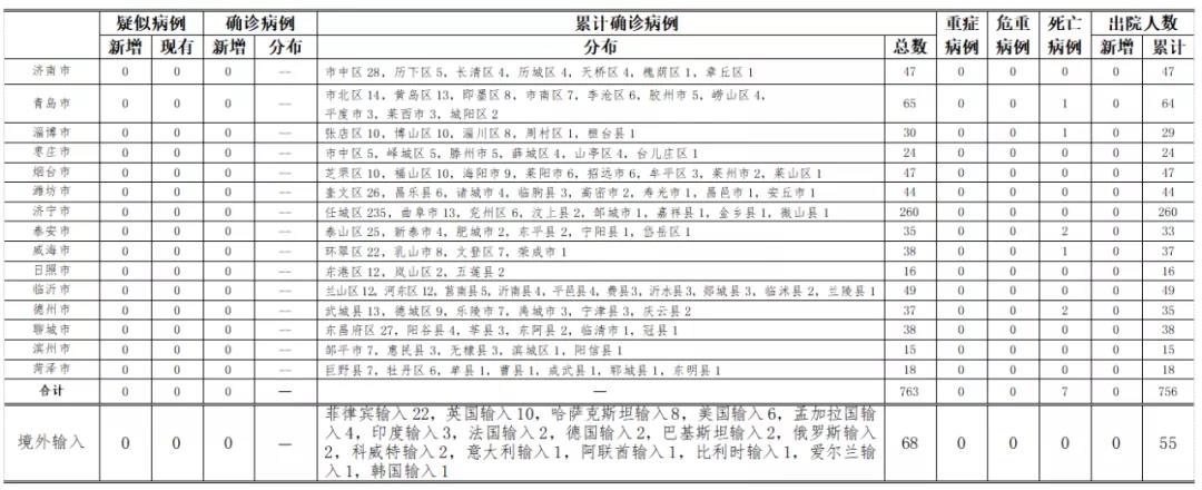 2020年9月9日0时至24时: 山东无本地住院疑似病例、确诊病例。累计报告确诊病例763例,死亡7例,治愈出院756例。 山东无新增境外输入疑似病例、确诊病例。累计报告境外输入确诊病例68例,累计治愈出院55例。 山东无新增无症状感染者。正在隔离观察治疗的无症状感染者15例(均为境外输入),出院3例。 目前共追踪到密切接触者25028人,尚有165人正在接受医学隔离观察。 详见下表(单位:例):