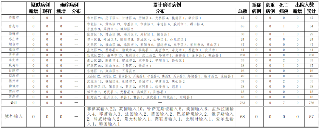 备注:1.山东省本地病例按确诊时医院所在县区统计,境外输入病例单独统计。