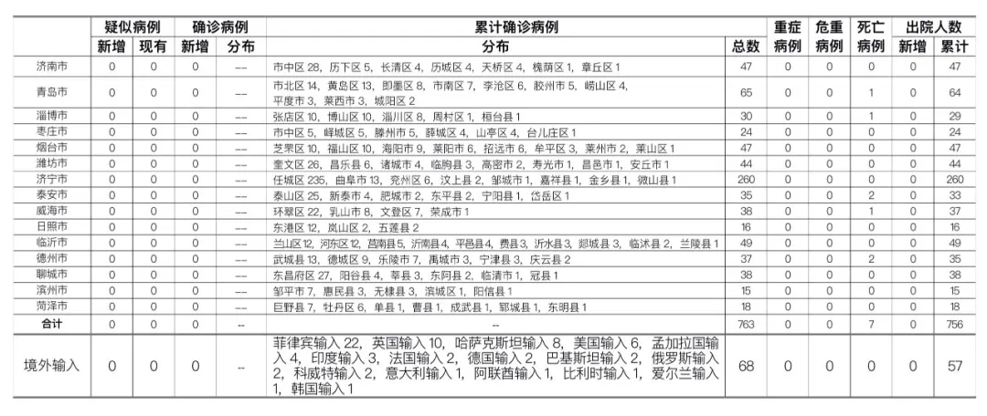 备注:1.山东省本地病例按确诊时医院所在县区统计,境外输入病例单独统计。
