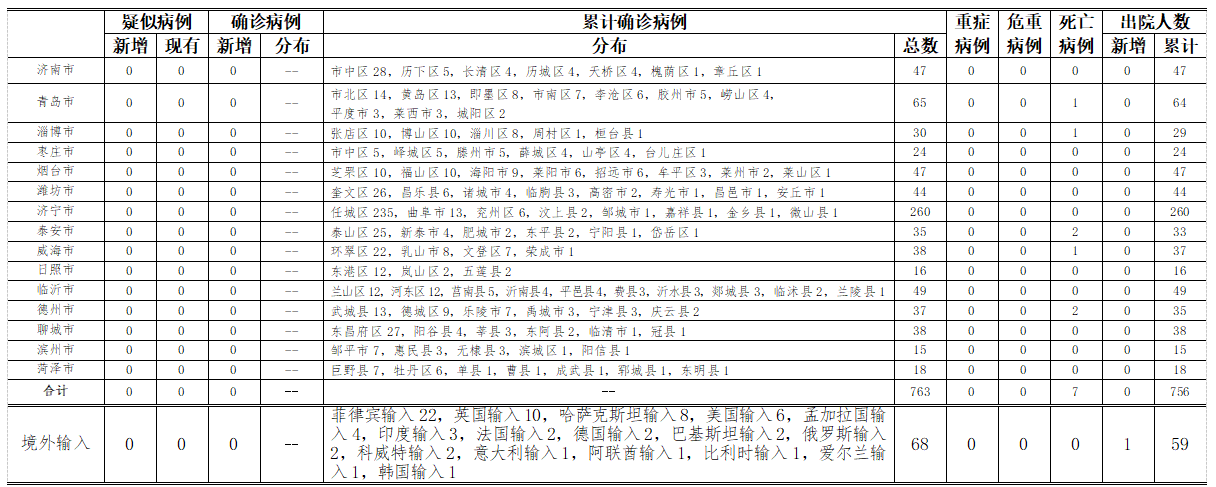 山东无本地住院疑似病例、确诊病例。累计报告确诊病例763例,死亡7例,治愈出院756例。