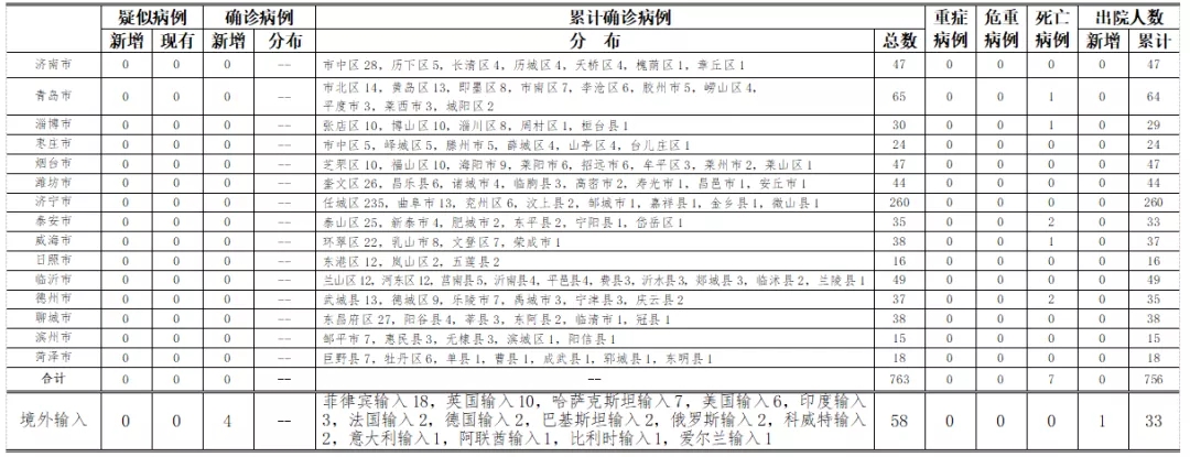 备注:1.山东省本地病例按确诊时医院所在县区统计,境外输入病例单独统计。