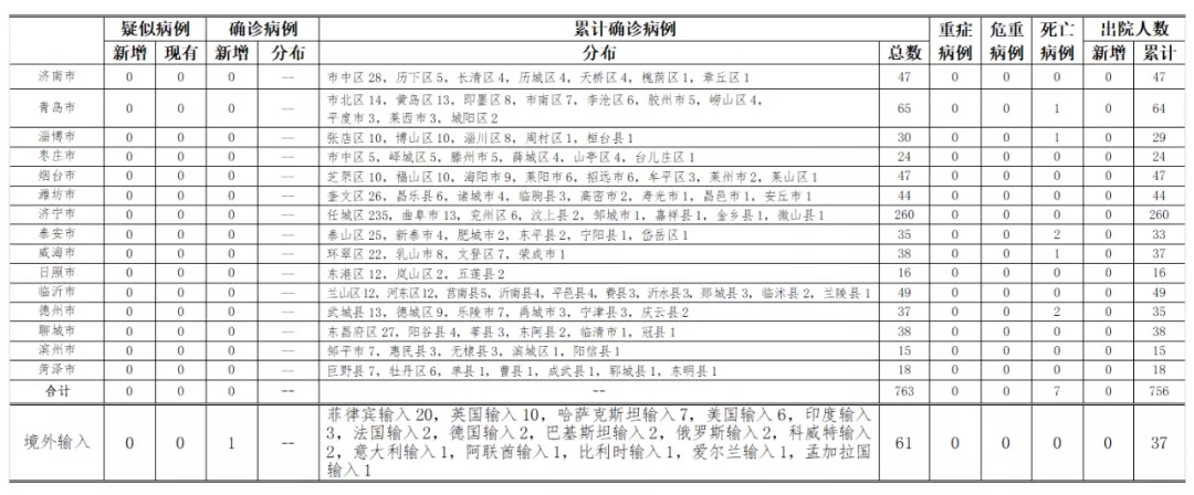 备注:1.山东省本地病例按确诊时医院所在县区统计,境外输入病例单独统计。
