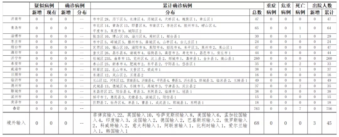 备注:1.山东省本地病例按确诊时医院所在县区统计,境外输入病例单独统计。