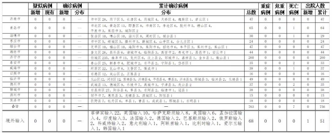 山东无本地住院疑似病例、确诊病例。累计报告确诊病例763例,死亡7例,治愈出院756例。