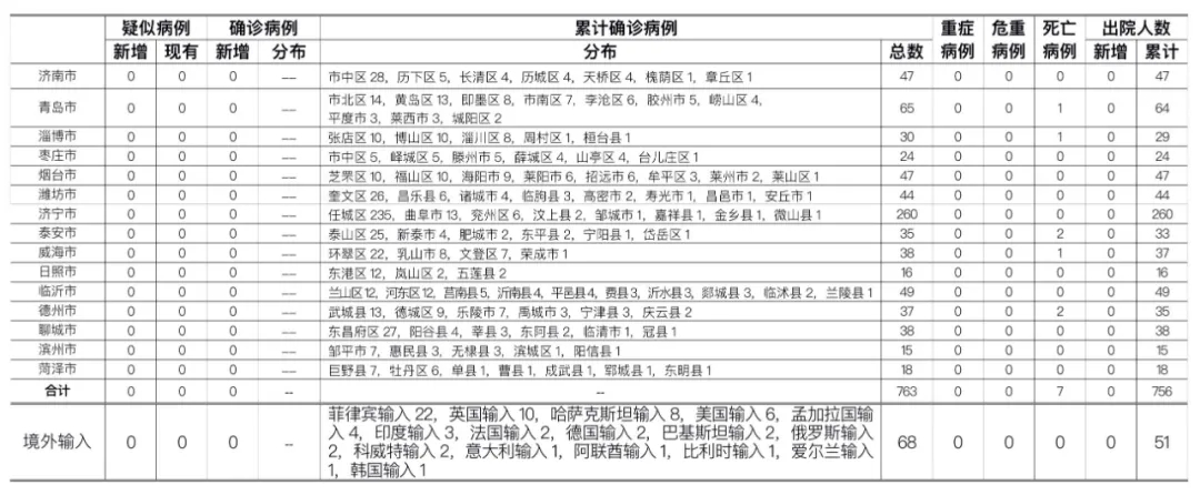 备注:1.山东省本地病例按确诊时医院所在县区统计,境外输入病例单独统计。