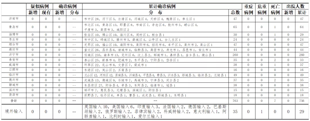 山东无本地住院疑似病例、确诊病例。累计报告确诊病例763例,死亡7例,治愈出院756例。