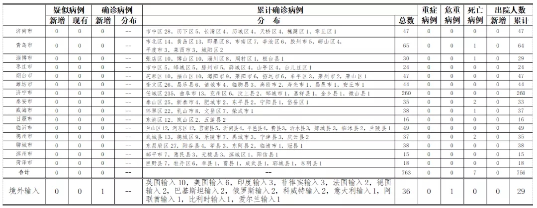 山东无本地住院疑似病例、确诊病例。累计报告确诊病例763例,死亡7例,治愈出院756例。