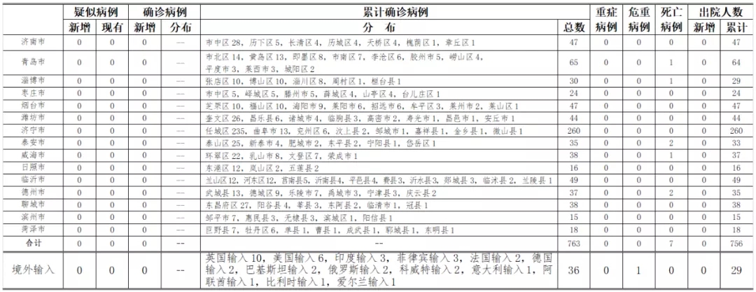 备注:1.山东省本地病例按确诊时医院所在县区统计,境外输入病例单独统计。