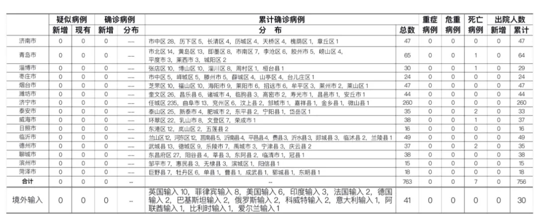 山东无本地住院疑似病例、确诊病例。累计报告确诊病例763例,死亡7例,治愈出院756例。
