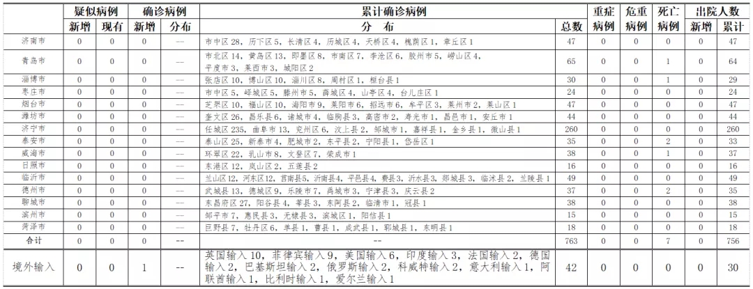 备注:1.山东省本地病例按确诊时医院所在县区统计,境外输入病例单独统计。