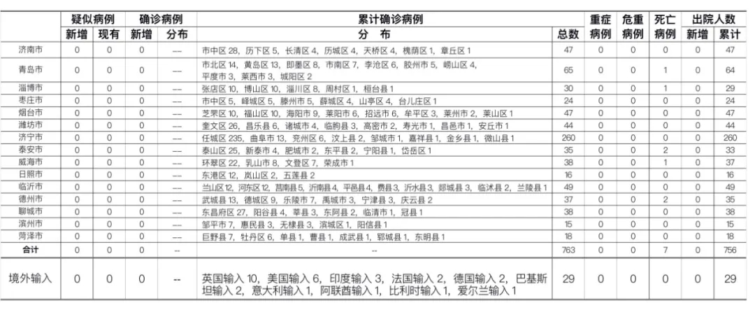 山东无本地住院疑似病例、确诊病例。累计报告确诊病例763例,死亡7例,治愈出院756例。