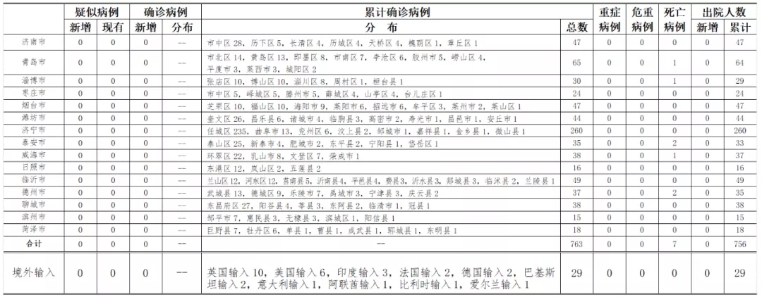 山东无本地住院疑似病例、确诊病例。累计报告确诊病例763例,死亡7例,治愈出院756例。