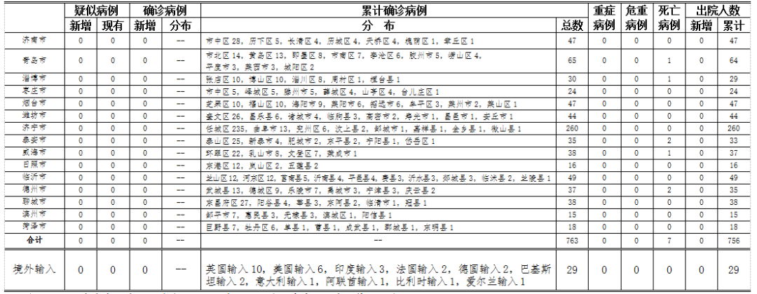 山东无本地住院疑似病例、确诊病例。累计报告确诊病例763例,死亡7例,治愈出院756例。