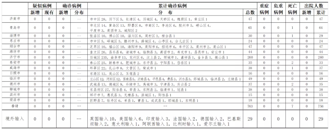 山东无本地住院疑似病例、确诊病例。累计报告确诊病例763例,死亡7例,治愈出院756例。