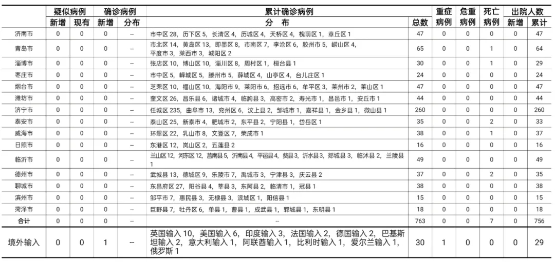 备注:1.山东省本地病例按确诊时医院所在县区统计,境外输入病例单独统计。