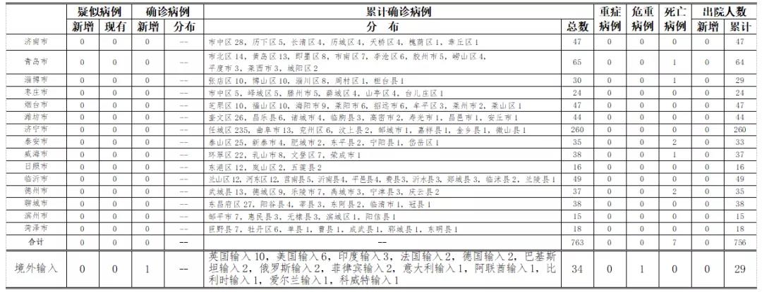 山东无本地住院疑似病例、确诊病例。累计报告确诊病例763例,死亡7例,治愈出院756例。