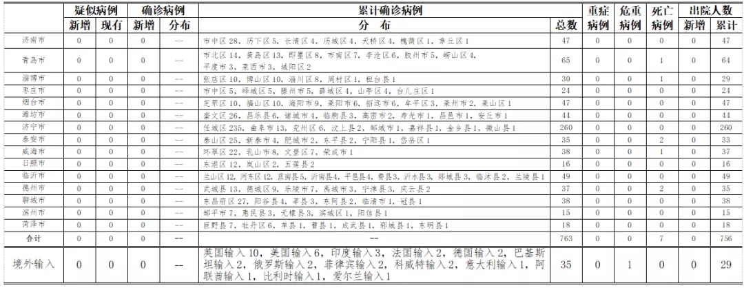 山东无本地住院疑似病例、确诊病例。累计报告确诊病例763例,死亡7例,治愈出院756例。