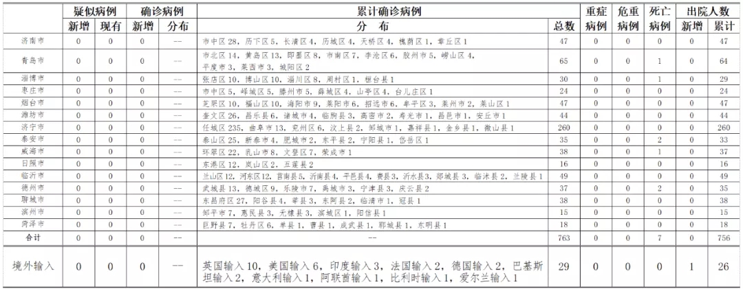 2020年6月13日0时至24时:山东无本地住院疑似病例、确诊病例。累计报告确诊病例763例,死亡7例,治愈出院756例。山东无新增境外输入疑似病例、确诊病例。累计报告境外输入确诊病例29例。新增治愈出院病例1例,累计治愈出院26例。山东无新增无症状感染者。正在隔离观察治疗的无症状感染者2例(境外输入)。目前共追踪到密切接触者22130人,尚有261人正在接受医学观察。详见下表(单位:例):