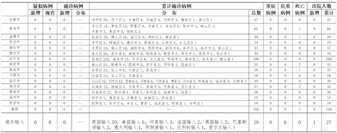 备注:1.山东省本地病例按确诊时医院所在县区统计,境外输入病例单独统计。