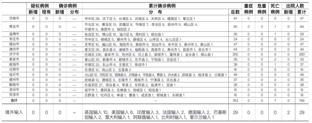 山东无本地住院疑似病例、确诊病例。累计报告确诊病例763例,死亡7例,治愈出院756例。