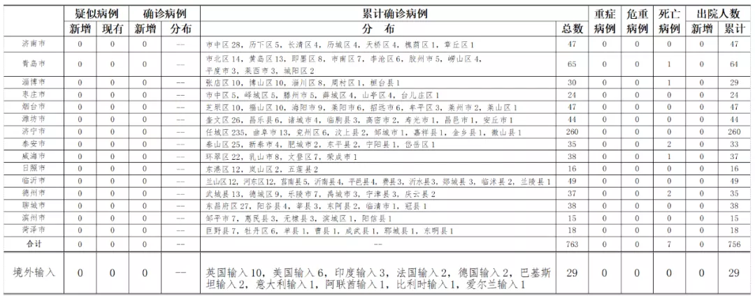 山东无本地住院疑似病例、确诊病例。累计报告确诊病例763例,死亡7例,治愈出院756例。