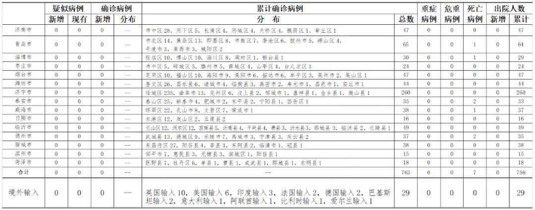 2020年6月28日0时至24时:山东无本地住院疑似病例、确诊病例。累计报告确诊病例763例,死亡7例,治愈出院756例。山东无新增境外输入疑似病例、确诊病例。累计报告境外输入确诊病例29例,治愈出院29例。山东无新增无症状感染者。正在隔离观察治疗的无症状感染者2例(境外输入)。目前共追踪到密切接触者22200人,尚有35人正在接受医学观察。详见下表(单位:例):