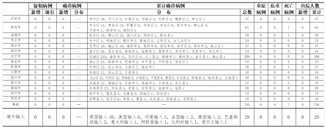 山东无本地住院疑似病例、确诊病例。累计报告确诊病例763例,死亡7例,治愈出院756例。