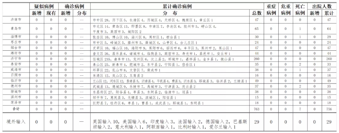 山东无本地住院疑似病例、确诊病例。累计报告确诊病例763例,死亡7例,治愈出院756例。