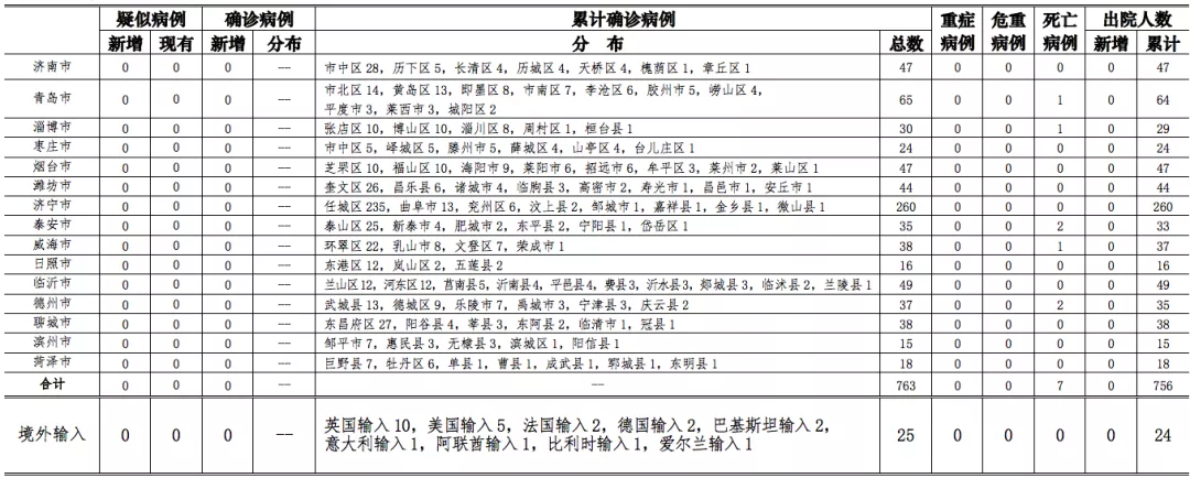 山东无本地住院疑似病例、确诊病例。累计报告确诊病例763例,死亡7例,治愈出院756例。