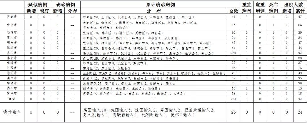 山东无本地住院疑似病例、确诊病例。累计报告确诊病例763例,死亡7例,治愈出院756例。