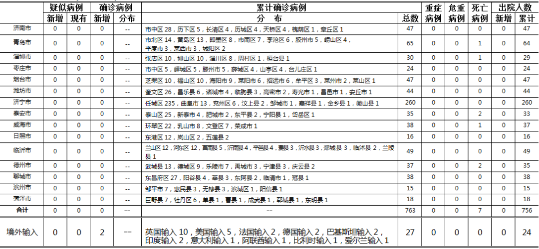 山东无本地住院疑似病例、确诊病例。累计报告确诊病例763例,死亡7例,治愈出院756例。
