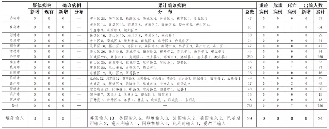 备注:1.山东省本地病例按确诊时医院所在县区统计,境外输入病例单独统计。